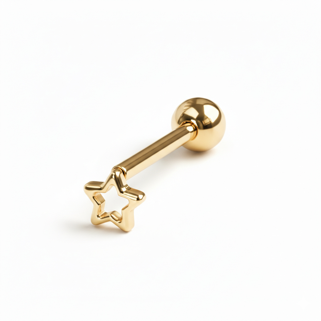 Esta barra de titanio para la lengua con estrella es hipoalergénica, ideal para pieles sensibles. Tiene rosca interna, lo que significa que se inserta el vástago liso a través del piercing y se enrosca.