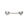 Esta barra para el pezón de titanio incluye preciosas gemas en forma de corazón a cada extremo, que puedes elegir entre piedras circonitas cúbicas transparentes, rojas o rosas. El cierre de la barra es a presión o push-in, por lo que es muy fácil de colocar y asegurar. Disponible en varios tamaños.