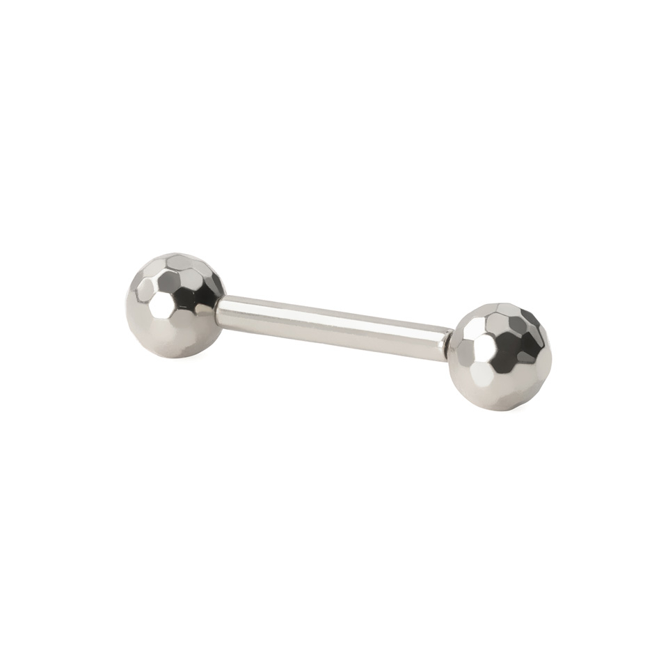 Esta barra de titanio incluye bolas facetadas a los extremos que lucen el efecto de bolas de disco. La joya no tiene rosca, sino que cuenta con un sistema push-in con el que puedes colocarla y quitarla en un abrir y cerrar de ojos - solo tienes que insertar las bolas en la barra, sin necesidad de enroscar nada.