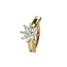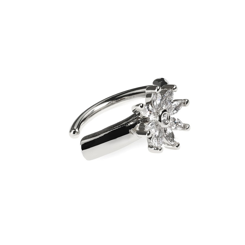 Este distinguido aro clicker para el ombligo incluye una flor destellante en el centro. La flor está hecha de 9 piedras de circonita. Esta joya está disponible en acabados dorado o plateado.