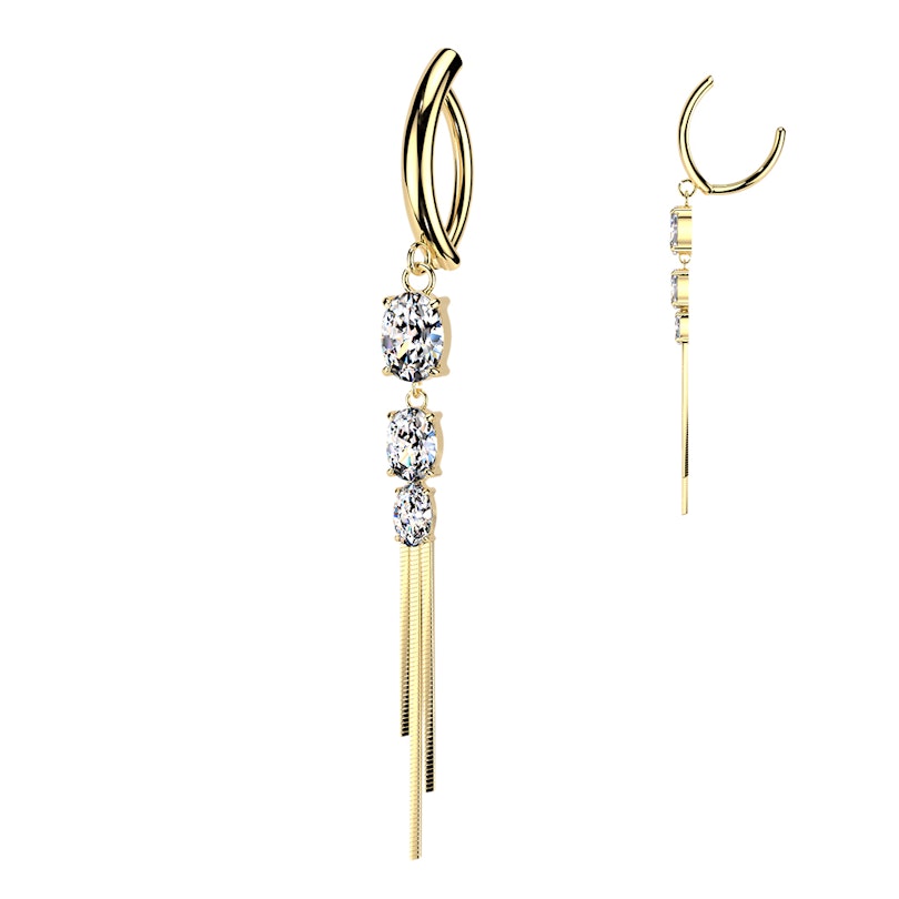 El clicker para el ombligo con piedras y cadenas añade un extra de detalle a tu piercing de ombligo. Las piedras quedan en el centro con un engaste de garras limpio, y finas cadenas cuelgan debajo para un look más arreglado. Disponible en dorado y plateado, es la joya que eliges cuando quieres algo más que una simple barra.