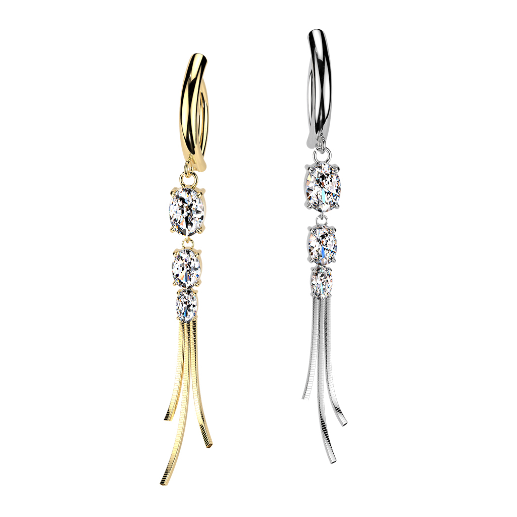 El clicker para el ombligo con piedras y cadenas añade un extra de detalle a tu piercing de ombligo. Las piedras quedan en el centro con un engaste de garras limpio, y finas cadenas cuelgan debajo para un look más arreglado. Disponible en dorado y plateado, es la joya que eliges cuando quieres algo más que una simple barra.