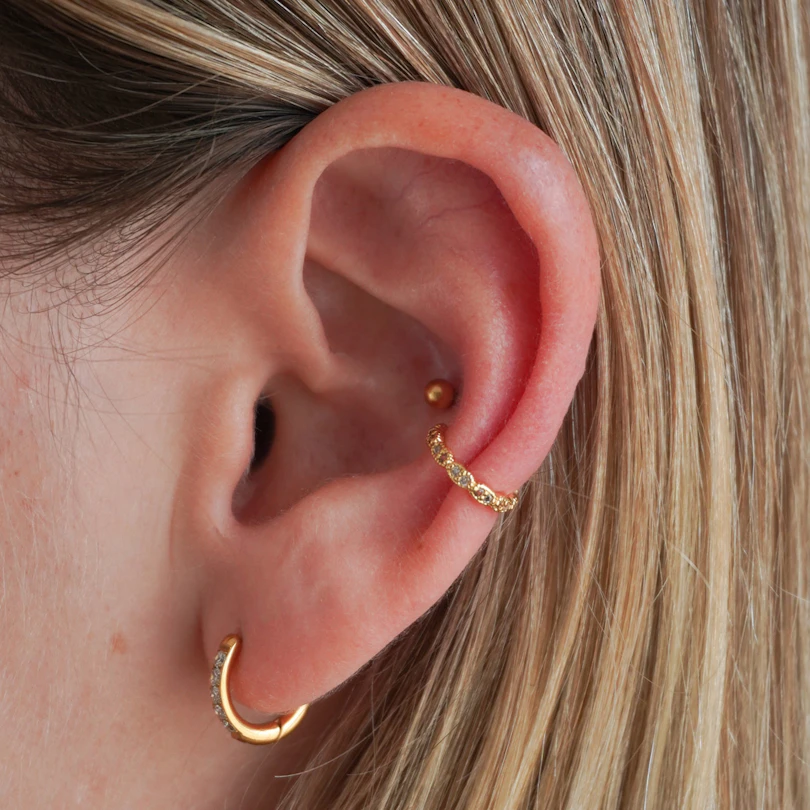 Fabricado en latón bañado en oro, es apto para la mayoría de tipos de piel y pensado para el uso diario. Resistente a salpicaduras, duradero y fácil de usar, este ear cuff te permite cambiar el look sin tener que comprometerse a nada permanente.
