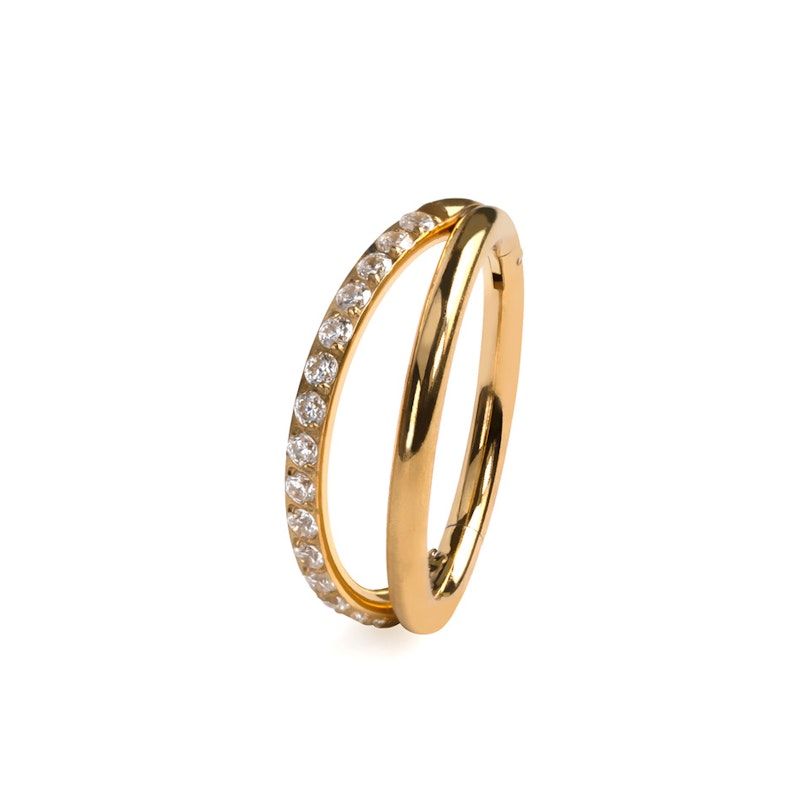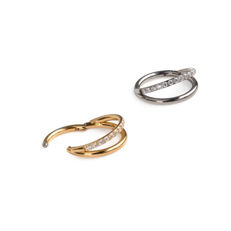 Este doble aro de titanio con pedrería en una banda de la tendencia Bodymod se mantiene original con un diseño dividido: una mitad lisa y minimalista, la otra mitad forrada de piedras. Dos estados de ánimo, un solo aro. Fabricado con titanio ASTM F136 (es decir, el mejor), es hipoalergénico, waterproof y duradero para toda una vida. Disponible en oro o plata y en medidas que te sentarán de maravilla. Su diseño con bisagra lo hace fácil de llevar, sin necesidad de ir al baño a las 3 de la mañana. El nuevo mejor amigo de tus piercings, ya que lo puedes llevar para: conch, helix, rook, septum, snakebite, spiderbite, tragus, o labret inferior. Brilla, es cómodo, versátil. Añade uno y mira como pasas de "qué lindo" a "no puedo parar de mirarlo".