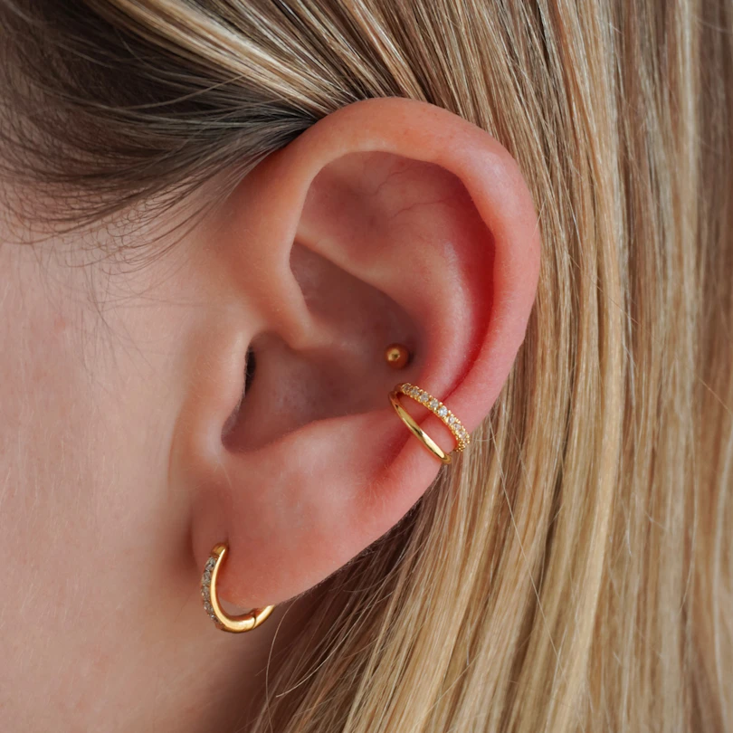 El doble ear cuff para la oreja con circonitas cúbicas es una forma fácil de añadir detalle sin comprometerte a tener un piercing. Diseñado para ajustarse a la oreja, te da la apariencia de dos piercings y a la vez resulta cómodo para llevar a diario. Pequeñas circonitas están montadas en un engaste de garras limpio, sumando el detalle justo. Disponible en colores oro y plata.