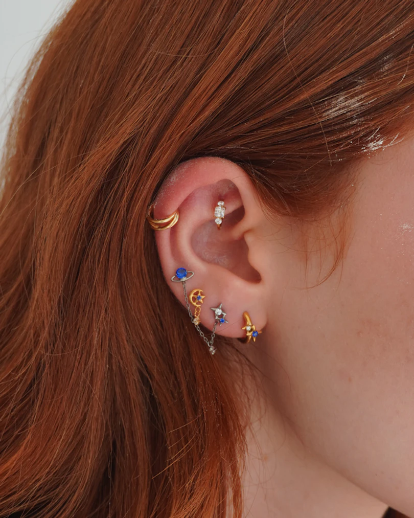 El dúo de labrets espaciales de titanio juega con la conexión y el movimiento. Uno presenta un pequeño planeta, mientras que el otro está decorado con estrellitas. Están unidos por una cadena fina, de la que cuelga una piedrecita en el centro. Circonitas transparentes y azules aportan un contraste sutil, manteniendo el look ligero, pero con un toque cósmico (¡sin pasarse!). Con acabado en color plata, están pensados para llevarse como par.