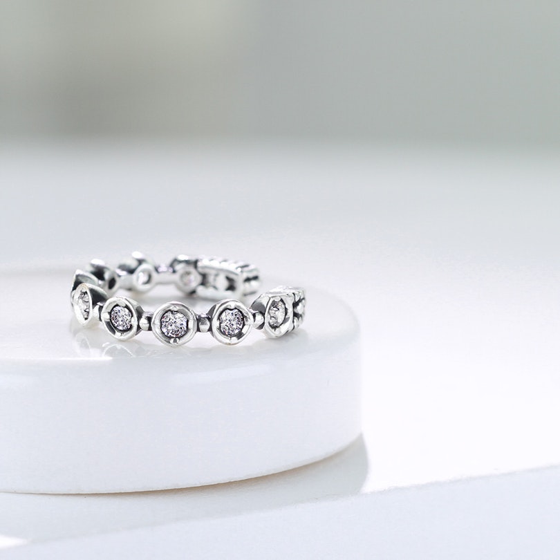 En el canto del diseño encontramos 9 bonitas circonitas, encastradas directamente en la joya. Estas están colocadas a lo largo de medio círculo, una a continuación de la otra. Cada una de ellas mide 1,5 mm, lo que significa que se trata de una joya bastante pequeña y discreta. Aun así, te sorprenderá su efecto cuando la lleves puesta.