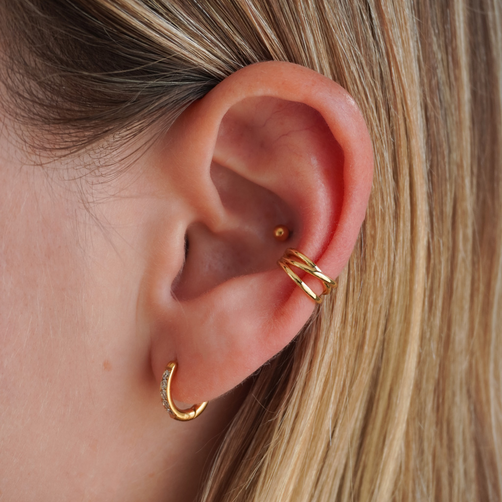 Líneas limpias con un toque estructurado. El ear cuff triple cruzado reúne tres bandas lisas para completar tu look de forma atrevida y equilibrada.