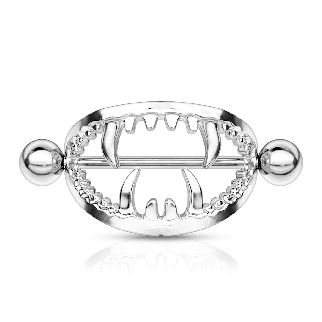 Este escudo para el pezón es un bocado muy apetitoso. Consiste en una barra de acero quirúrgico que atraviesa una boca con dientes y largos colmillos. Cuando te lo pongas en el piercing del pezón, parecerá que tu pezón está dentro de la boca.