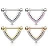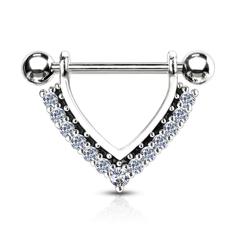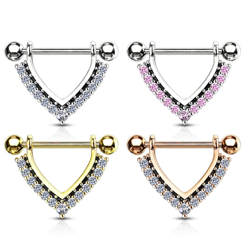 ¿Te gusta decorar tus pezones con brillantes llamativos pero delicados a la vez? Entonces nos busques más. Este escudo para el pezón trae 13 brillantes en total: 6 de cada lado del "triángulo", y uno más grande en el ángulo inferior. Estos brillantes pueden ser del color que tu elijas; cualquier opción irá muy bien con el color de la estructura de la joya, que también puedes elegir.