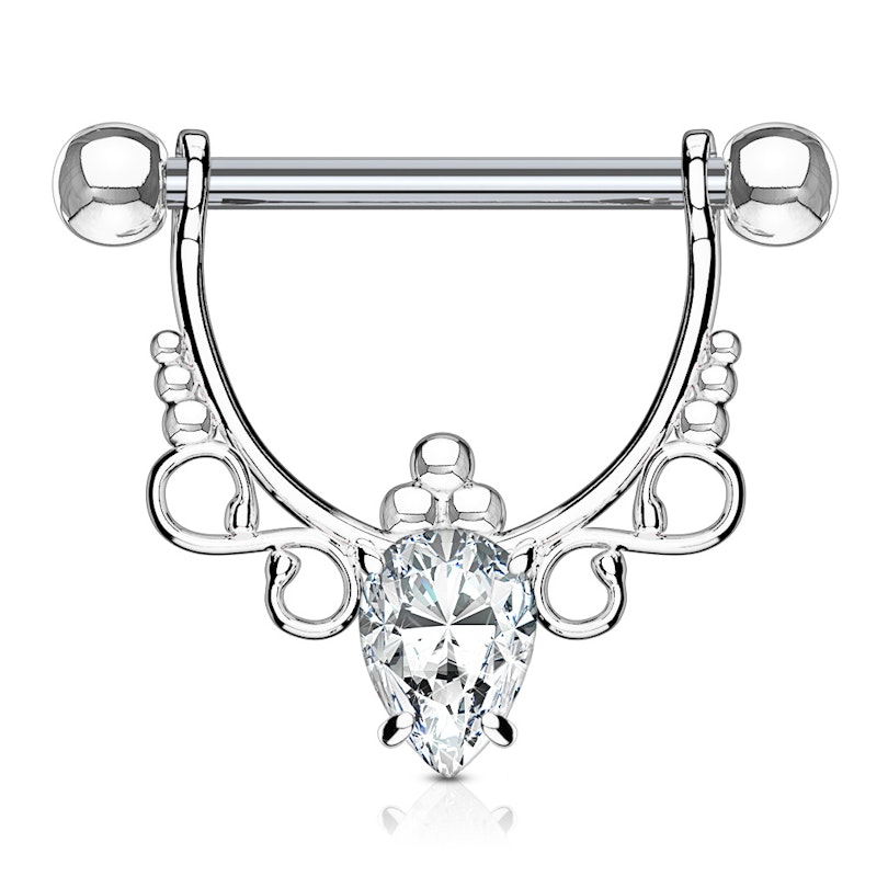 Este escudo para el pezón está adornado con una majestuosa piedra en forma de pera. El diseño de filigrana luce un símbolo de infinito a cada lado, que hacen del escudo un regalo ideal para ti o para quien más quieres.