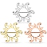 La barra está hecha en acero quirúrgico, el cual es el material más utilizado en el mundo de los piercings. El escudo, con sus bonitas formas onduladas, está hecho en cobre, que ha sido recubierto por una capa de rodio, que le da los bonitos colores plateados y dorados.