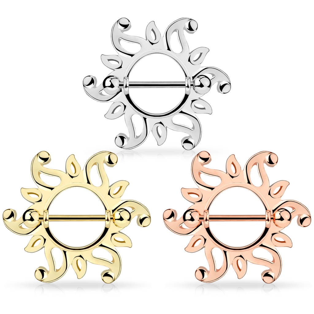Este escudo para el pezón es perfecto para ti si estás buscando algo especial para los encuentros íntimos con tu pareja. O también para ti, si quieres llevar una joya con la que podrás sentirte súper sexy. La joya consiste en una barra recta que atraviesa tu perforación en el pezón. En ella se sujeta el escudo, gracias a dos pequeños aretes a ambos lados de la barra. La barra mide 19 mm de largo, y el espacio libre que queda para el pezón es de 14 mm.