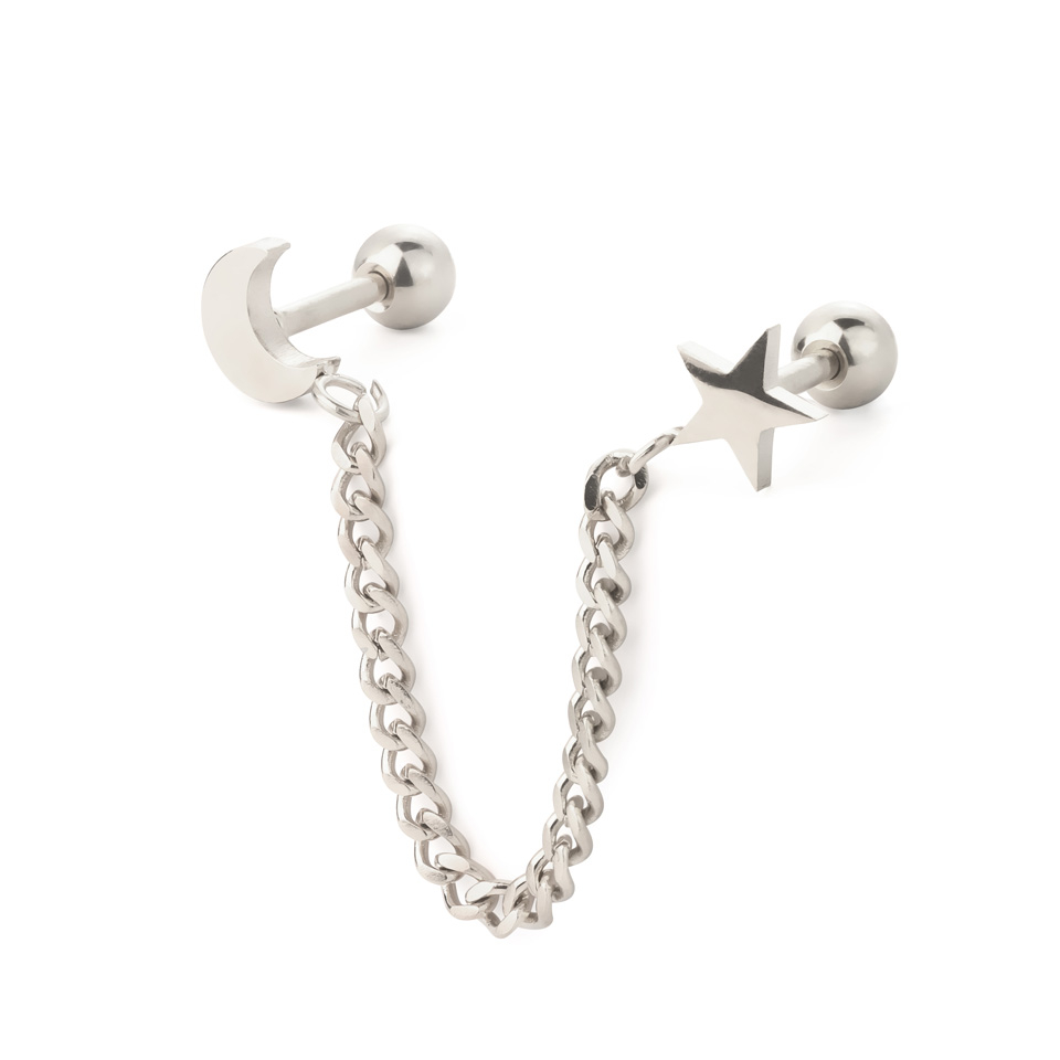 La longitud de la cadena es de aproximadamente 4 cm. La joya consiste en dos barras conectadas por una cadena. Ambas barras tienen 1,2 mm de grosor y 6 mm de largo. Vienen con una bola de cierre de 4 mm en la parte trasera. En la parte delantera, tienen una estrella y una medialuna, respectivamente.