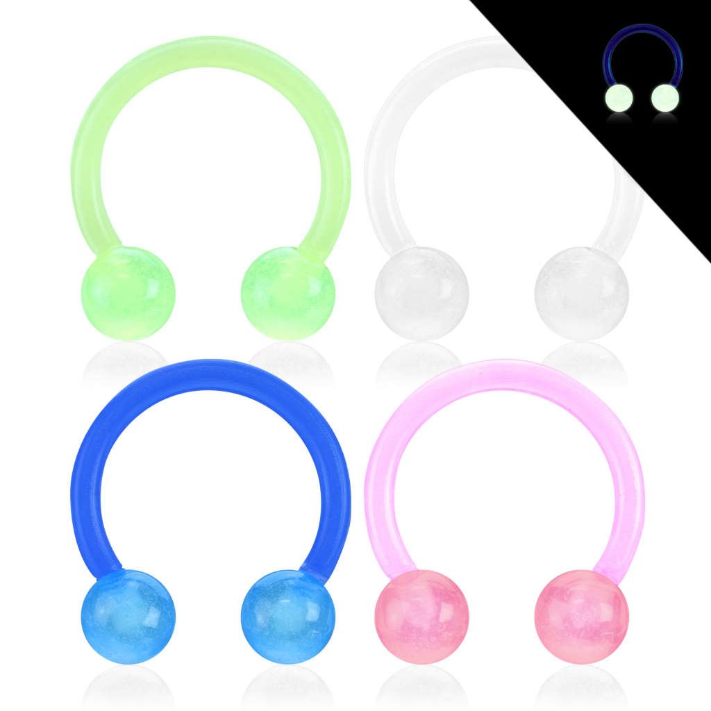 Si apagas la luz, la herradura que te mostramos brillará en la oscuridad. Se trata de una herradura luminiscente hecha de acrílico. Durante el día y con la luz natural, esta herradura tiene una apariencia normal, la diferencia es que la podrás distinguir en la oscuridad. Es pues una joya perfecta para salir de fiesta, que además puedes elegir entre varios colores distintos. Además, puedes llevar herraduras en muchos tipos de piercings, siempre que las medidas sean adecuadas. Por ejemplo, puedes llevarla en el piercing en el septum, así como en la ceja o en la oreja.