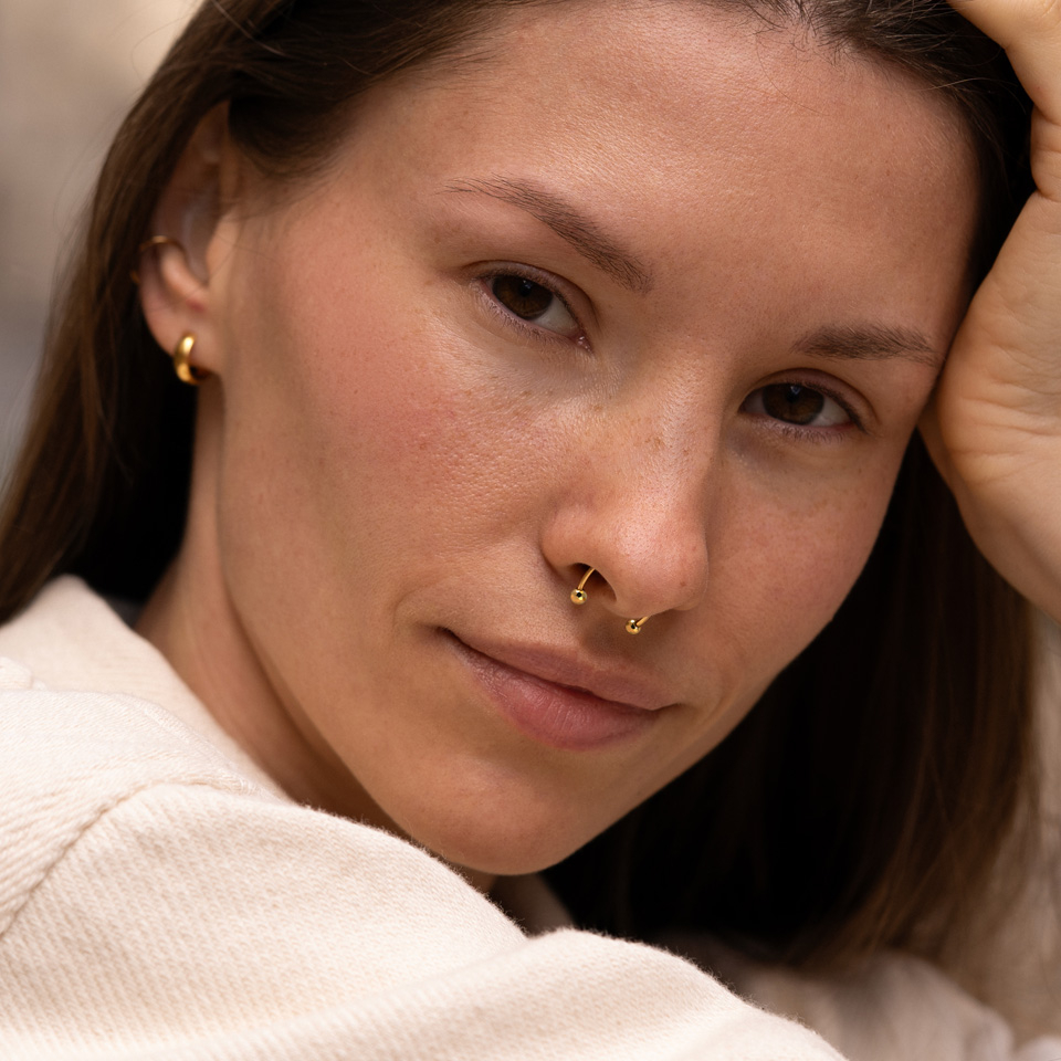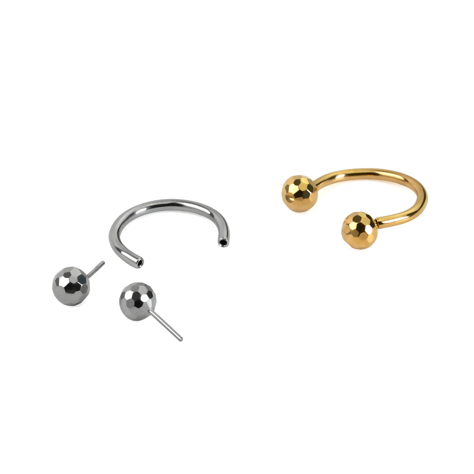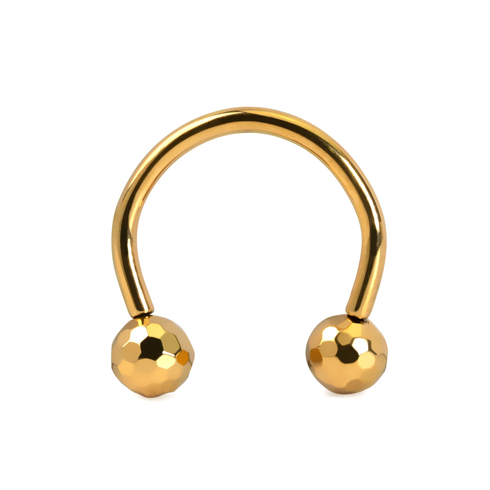 Esta herradura de titanio no tiene roscas; las bolas cuentan con pequeños pasadores que se empujan en cada extremo de la barra curvada para asegurar la joya en tu piercing. Las bolas están facetadas y lucen una textura única que recuerda a mini bolas de disco. Es una joya ideal para múltiples piercings, incluidos piercings en las cejas o septum, y está disponible en acabados oro y plateado.