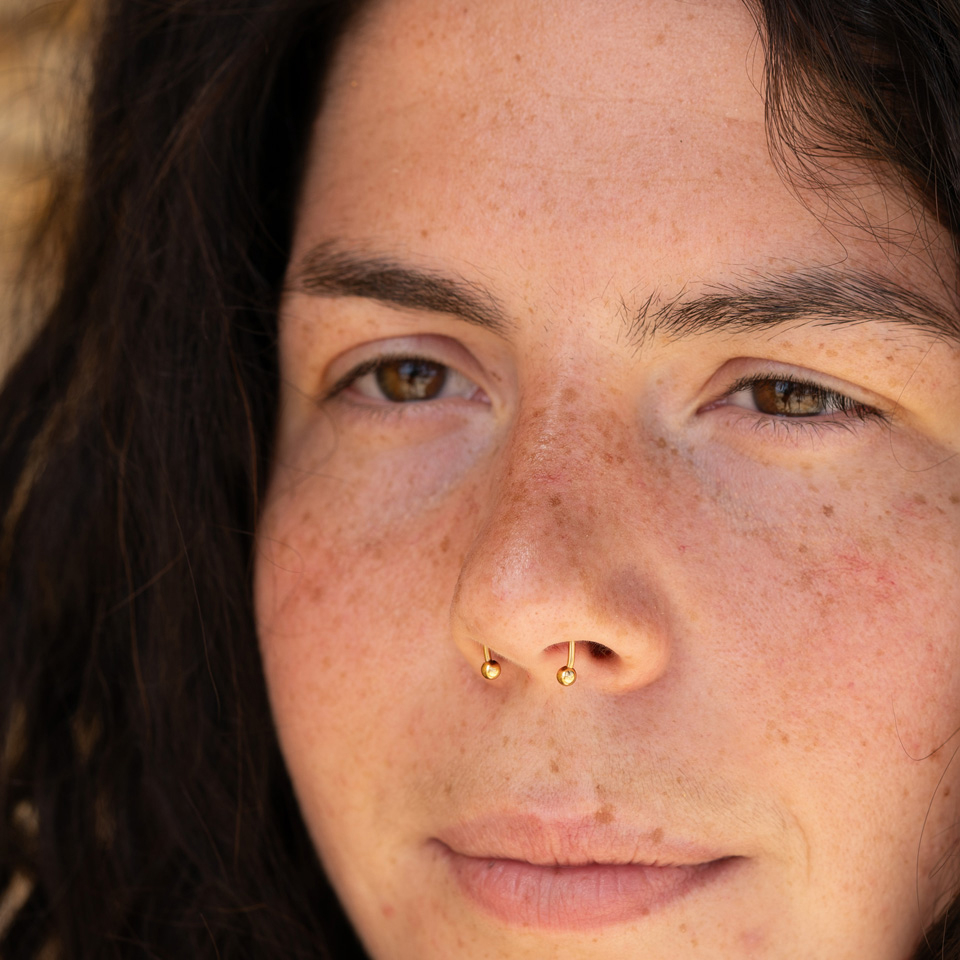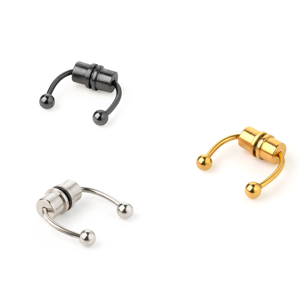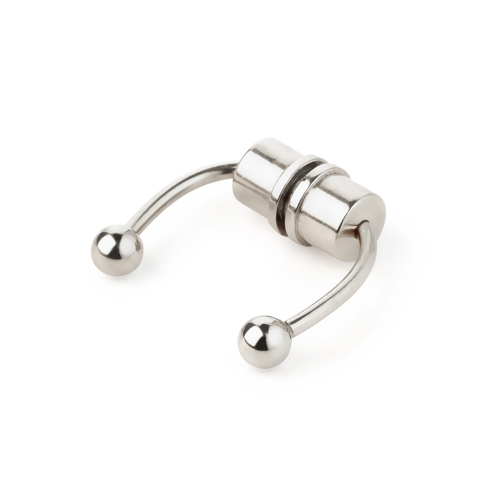 Diseñar piercings falsos no es fácil, ya que las joyas para piercings están hechas para atravesar la piel. Algunas joyas falsas están compuestas por una sola pieza: se les añade un pequeño muelle para que se agarren a la piel al expandirse. Esta herradura, en cambio, está dividida en dos partes y se sostiene a través de imanes. Queda mejor en aquellos lugares donde está parcialmente oculta, por ejemplo, en el septum. Si la llevas en otras partes donde el agujero del piercing queda visible, los imanes también se verán.