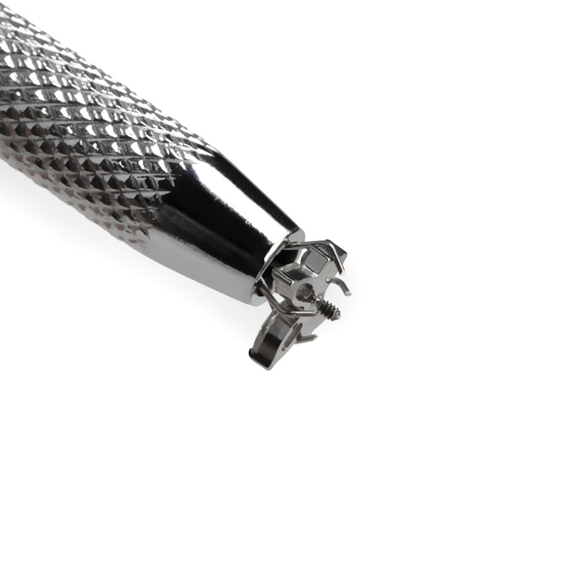 La herramienta tiene cuatro finos dientes que se abren desde la punta cuando se presionan, sujetando bolitas de entre 3 y 6 mm mientras las atornillas a tu barra, aro o barra de labret. Solo asegúrate de que el agujero o el tornillo de la bolita quede hacia afuera, así es como hace su magia.