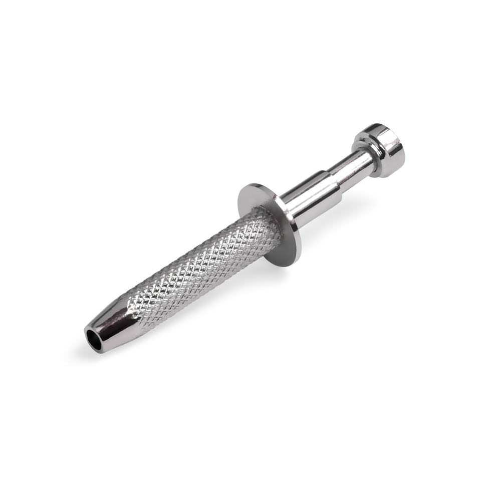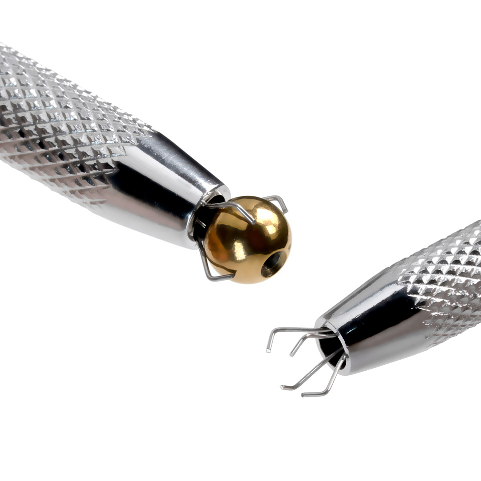 La herramienta tiene cuatro finos dientes que se abren desde la punta cuando se presionan, sujetando bolitas de entre 3 y 6 mm mientras las atornillas a tu barra, aro o barra de labret. Solo asegúrate de que el agujero o el tornillo de la bolita quede hacia afuera, así es como hace su magia.