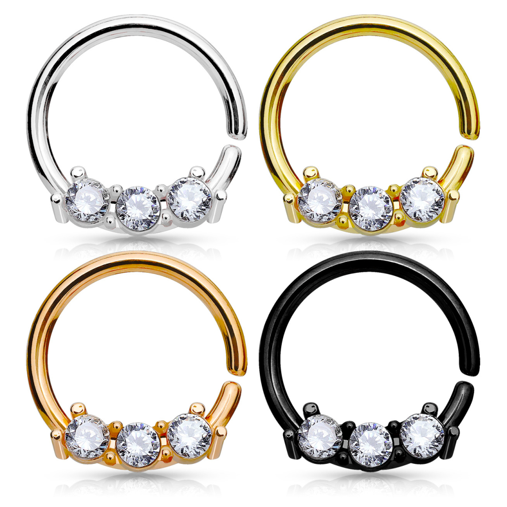 La mayoría de joyas para el septum son grandes y muy vistosas, y pocas consisten en un sencillo aro o en un aro segmentado. Además, si llevan brillantes parecen todavía más grandes y voluminosas. Si lo que quieres es un look totalmente opuesto y delicado, te invitamos a que descubras esta preciosidad que consiste en un aro con varios brillantes pequeños