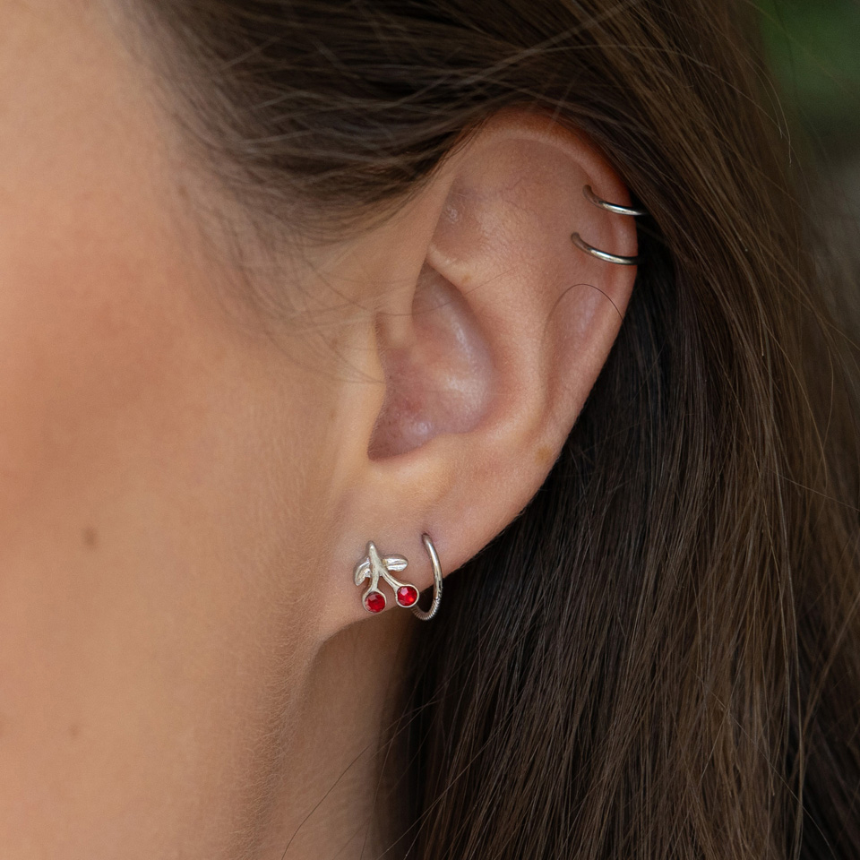 La barra de esta joya mide 6 mm, por lo que se ajusta a la mayoría de perforaciones. Por la parte de delante tiene dos bonitas cerecitas, con brillantes de color rojo.