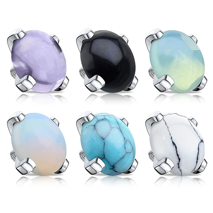 Las garras de la joya sujetan una piedra semipreciosa redonda, la cual puedes elegir. Hay varios tipos, como por ejemplo la opalita o la amatista, y con cada una de ellas conseguirás un efecto distinto para tu piercing. Cada piedra mide 5mm, lo que significa que es lo bastante grande como para que se pueda apreciar. Al mismo tiempo, también está disponible en otros tamaños más pequeños, en caso de que así lo prefieras.