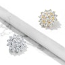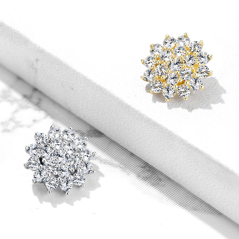 Aquí encontrarás una joya que definitivamente podrá decorar tu base dérmica. Este diseño presenta forma de flor, a la que se le ha aplicado una gran cantidad de piedras transparentes que le dan un inusitado brillo. Las piedras quedan en su lugar debido a unos pequeños dientes que sobresalen y se sostienen alrededor de cada una.