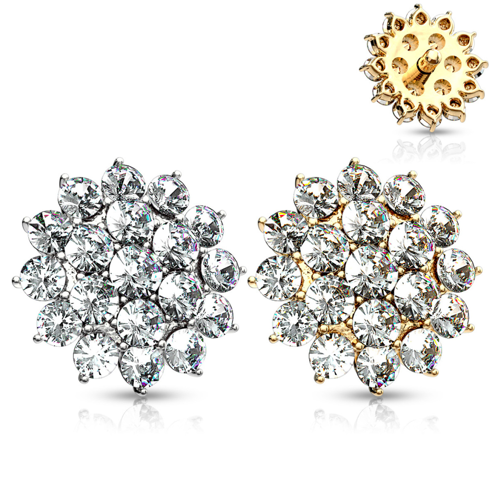 Aquí encontrarás una joya que definitivamente podrá decorar tu base dérmica. Este diseño presenta forma de flor, a la que se le ha aplicado una gran cantidad de piedras transparentes que le dan un inusitado brillo. Las piedras quedan en su lugar debido a unos pequeños dientes que sobresalen y se sostienen alrededor de cada una.
