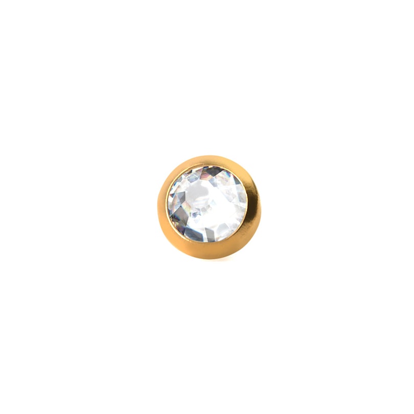 Esta joya para anclaje microdermal consiste en un pequeño disco, en el centro del cual hay un bonito brillante de color blanco.