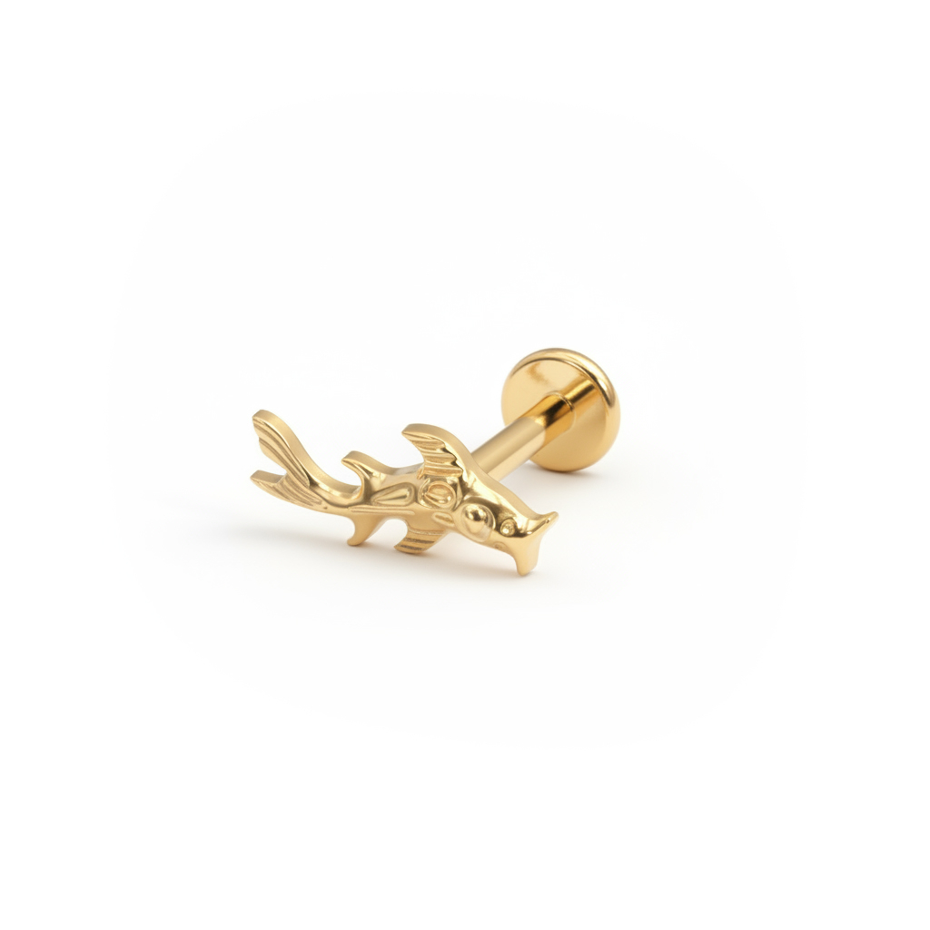 El labret carpa koi de titanio es más que una joya para lucir, porque con ella, hay significado. Se inspira en las carpas koi, que simbolizan la fuerza y la transformación. Este labret se va contigo a donde sea para estar contigo en tus momentos de cambio. Disponible en acabados dorado o plateado, su diseño está pensado hasta el último detalle.