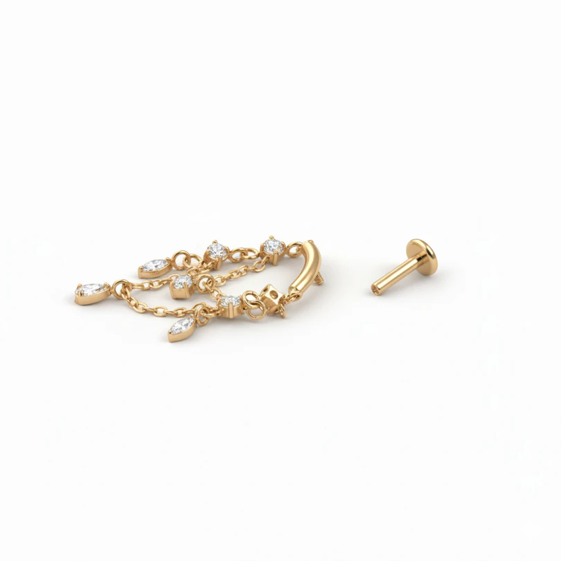 El labret con colgantes tipo candelabro de titanio va de moverse. Pequeñas gotas engastadas con piedras cuelgan bajo el labret, creando un balanceo suave que lo notas cuando giras la cabeza. Tiene un aire arreglado sin pasarse y funciona genial cuando quieres algo un poco distinto a tu joyería de cada día. Disponible en colores dorado y plateado.