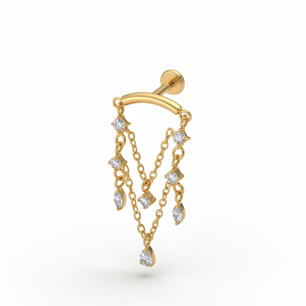 El labret con colgantes tipo candelabro de titanio va de moverse. Pequeñas gotas engastadas con piedras cuelgan bajo el labret, creando un balanceo suave que lo notas cuando giras la cabeza. Tiene un aire arreglado sin pasarse y funciona genial cuando quieres algo un poco distinto a tu joyería de cada día. Disponible en colores dorado y plateado.