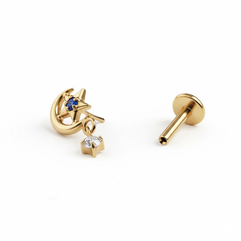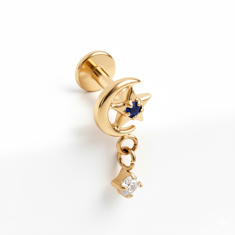El labret con luna y estrella con colgante de titanio le da un poco de movimiento a tu look. Una pequeña luna y una estrella están al frente, rematadas con un pequeño colgante que se balancea suavemente cuando te mueves. Es decorativo sin pasarse y queda genial cuando quieres algo más expresivo. Disponible en colores oro y plata.