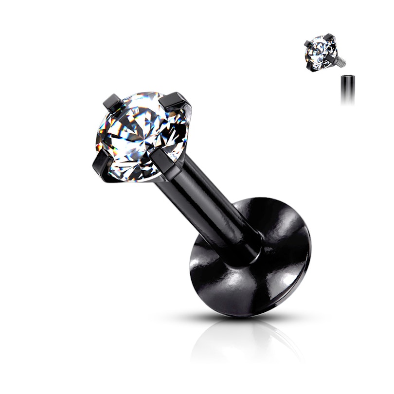 Este labret tiene un brillante de color blanco para todos los modelos, sea cual sea el color de barra que elijas. El brillante se mantiene en su lugar gracias a cuatro pequeñas garras unidas a la estructura de la joya. No tienes que preocuparte por exponer esta estupenda joya a la humedad o al vapor de un baño, ya que gracias a su tipo de sujeción y el material en el que está hecho, no hay riesgo de que se estropee.