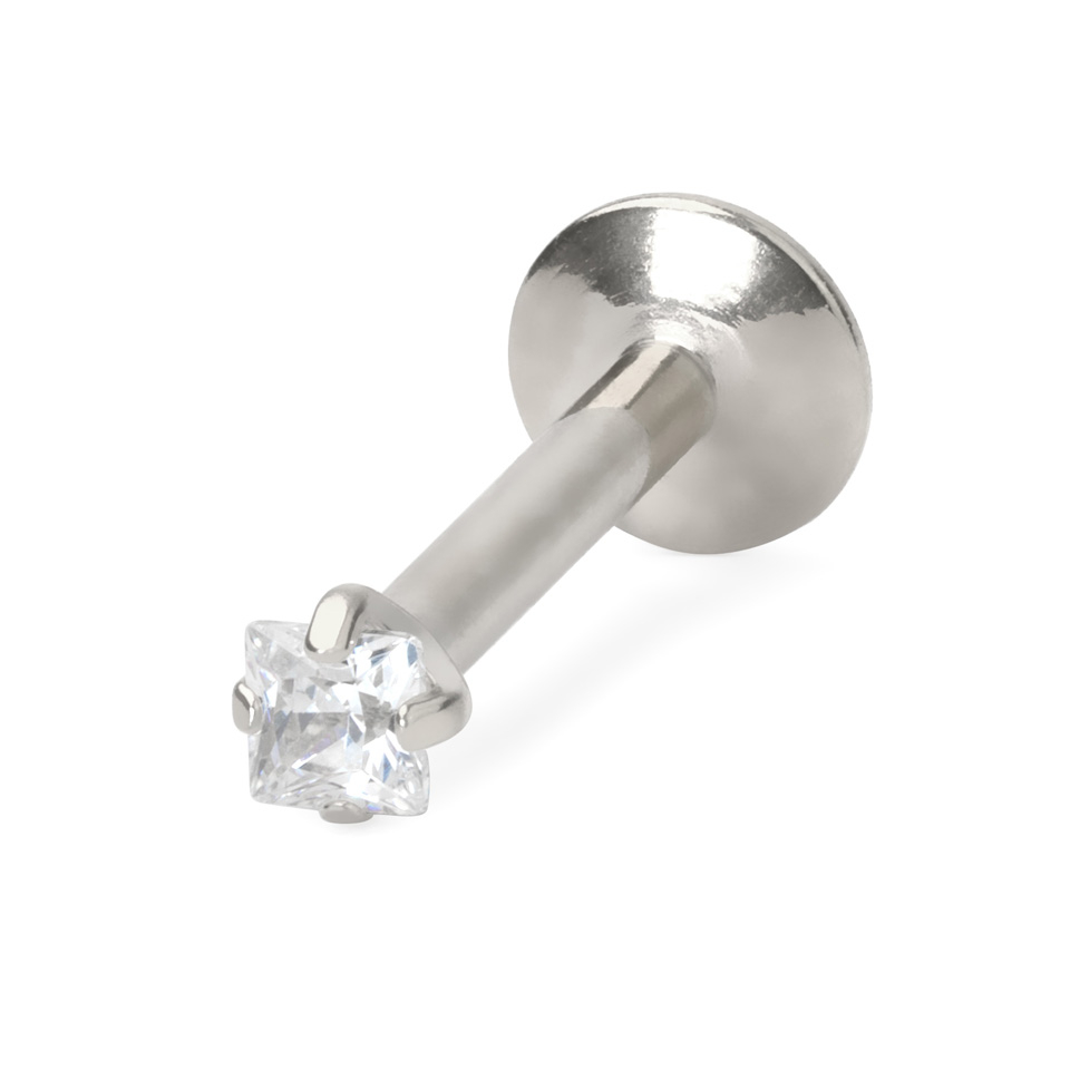 Este labret de acero quirúrgico luce una piedra brillante cuadrada engastada y es de rosca interna.
