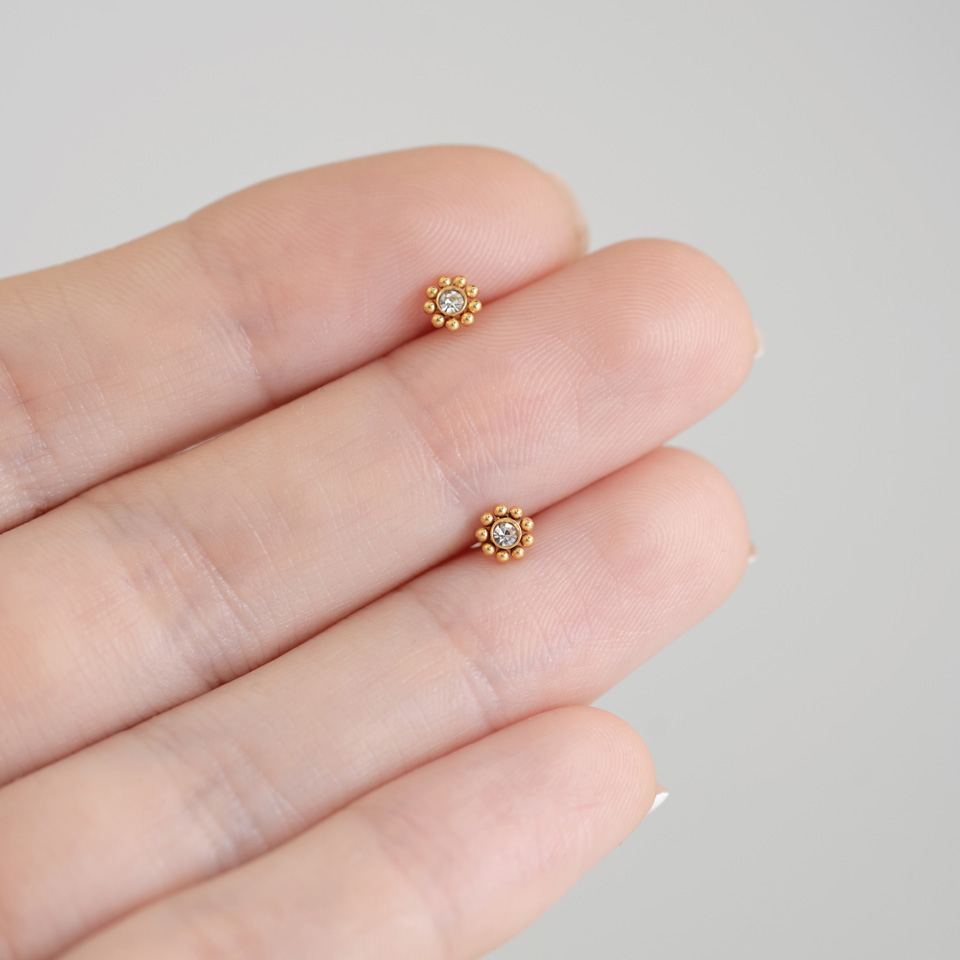 Los modelos también tienen en común el brillante de la parte frontal y la rosca interna que se enrosca en la barra trasera del labret. El hecho de que tengan rosca interna es una ventaja frente a una rosca externa, que puede dañar la piel que rodea el piercing. Una rosca interna evitará que eso suceda.