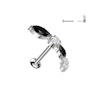 El labret curvado con pedrería negra y transparente lleva el ritmo y el contraste. Cuatro piedras engastadas en garras, alternando entre negras y transparentes, siguen una suave curva que llama la atención sin resultar exageradamente llamativa.