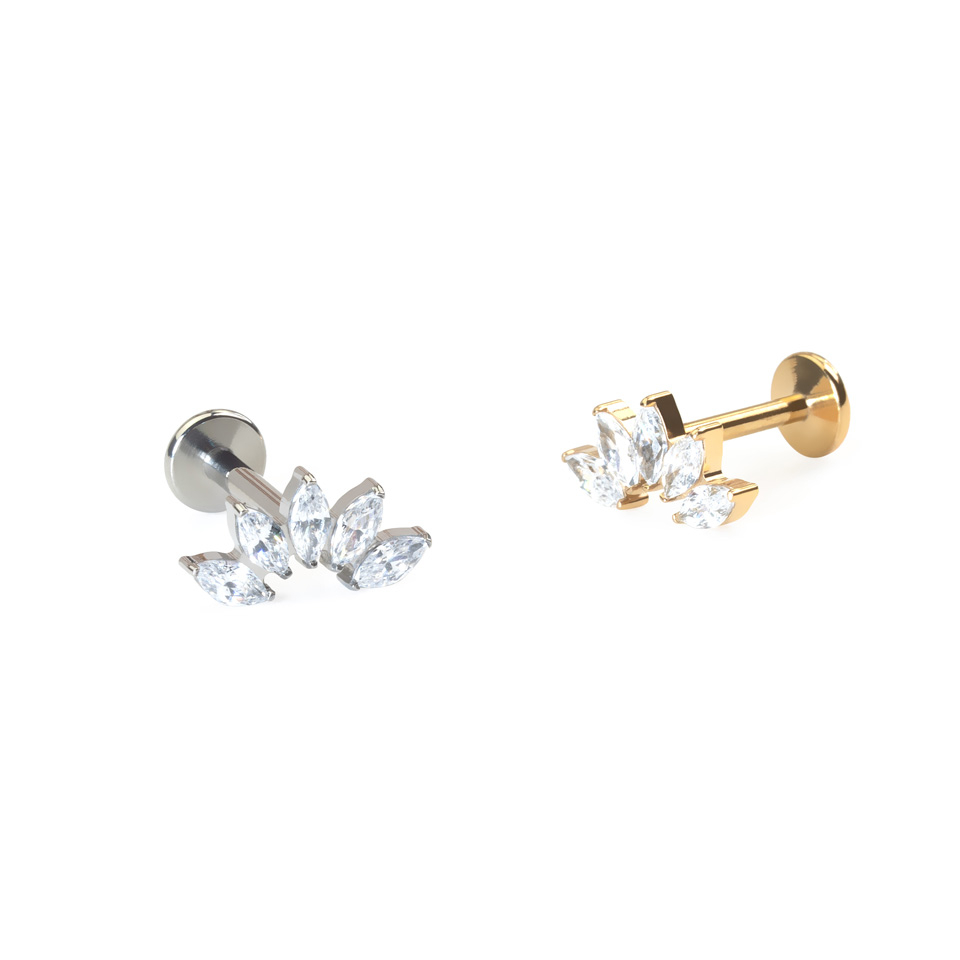 Este labret de titanio luce 5 piedras circonitas cúbicas en corte marquise, dispuestas en un diseño curvado. Es una joya de rosca interna, por lo que para ajustarla solo tienes que introducir la barra lisa en tu piercing y enroscar la parte superior. Al estar hecha de titanio, resulta cómoda de llevar incluso para pieles sensibles. Es ideal para varios piercings en la oreja, aunque te quedará especialmente bien en el helix o en el flat.