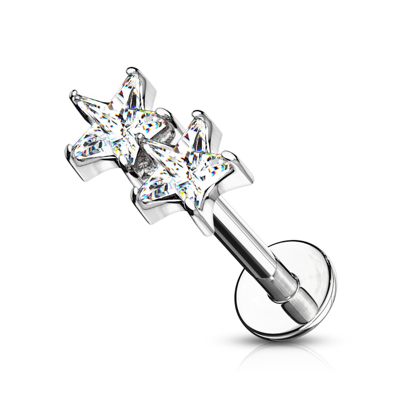 ¿Qué es mejor que una estrella? ¡Dos estrellas, por supuesto! Y eso es exactamente lo que conseguirás con este deslumbrante labret. Si te pones esta joya en el piercing de la oreja, todo el mundo quedará pasmado con el brillo de sus estrellas. El labret está equipado de rosca interna, mucho más fácil de colocar en el piercing que una joya de rosca externa.