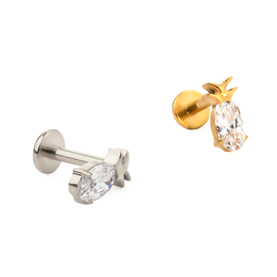 Este delicioso labret de titanio te dará un aire de lo más tropical con su encantador adorno de piña. Está empedrado con circonitas cúbicas para una chispa extra, garantizándote captar todas las miradas.