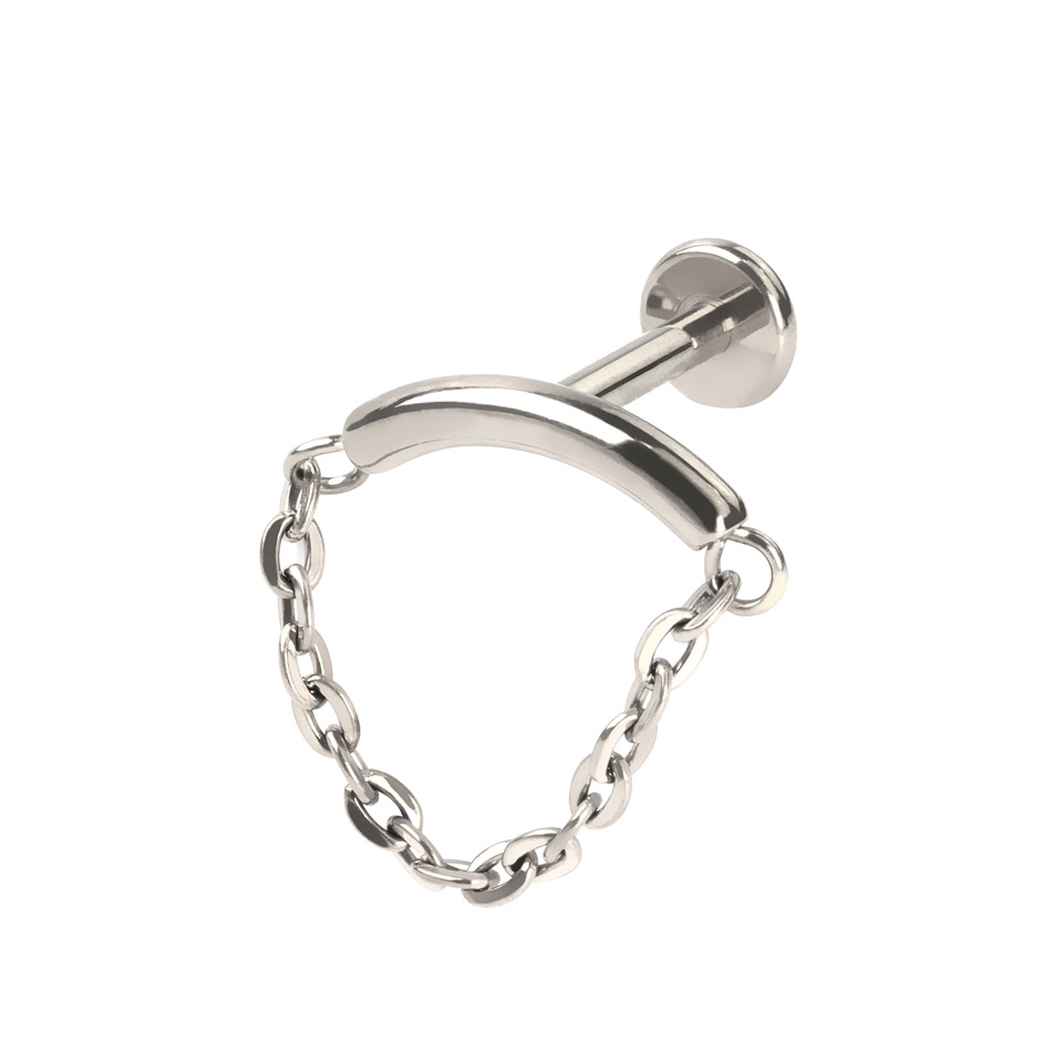 Este labret luce una barra curvada que se ajusta a la perfección a la forma de la oreja si eliges llevarlo en el piercing helix. También queda genial en el lóbulo. Incluye una delicada cadena adherida a ambos extremos de la barra, que cuelga grácilmente por debajo de esta.