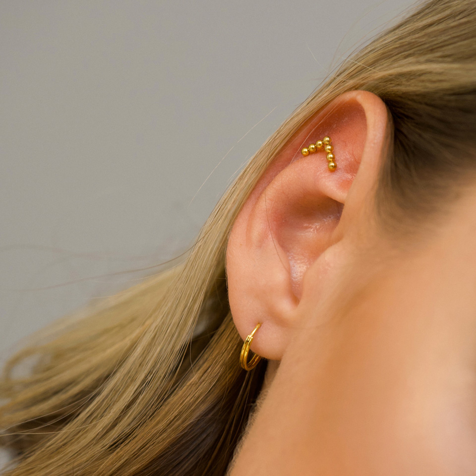 Labret de titanio decorado con bolitas en flecha en un diseño acorde con las últimas tendencias. La flecha está compuesta por 7 bolitas, cada una de 2 mm, y ambos lados miden 7,8 mm. Está disponible en color oro y plateado.
