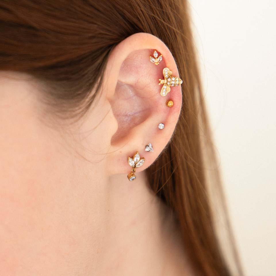 Este encantador labret incluye tres piedras biseladas en corte marquise dispuestas en forma de flor de lotus, además de una cuarta piedra que cuelga en la parte inferior.