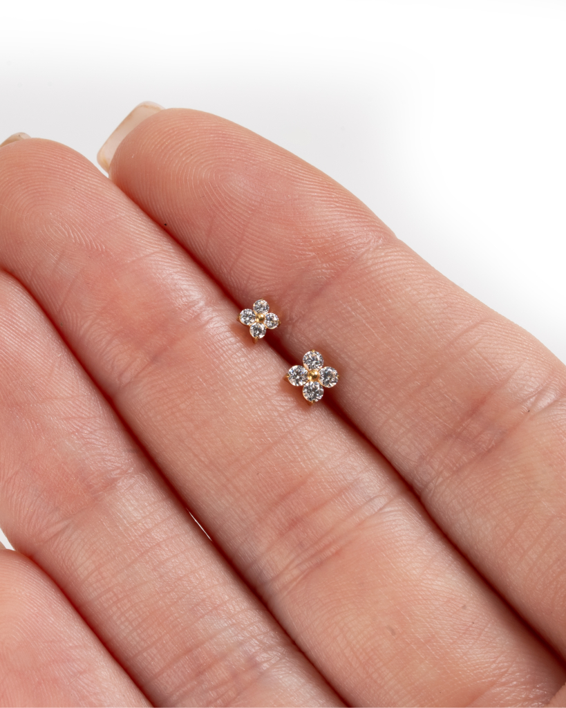 El labret de titanio con flor en miniatura añade un detalle suave y floral formado por pequeñas piedras dispuestas en forma de flor. Montadas en un engaste de garras prolijo, las piedras quedan cerca de la piel, aportando detalle sin resultar pesado. Disponible en colores dorado y plateado y en dos tamaños, la versión más pequeña se mantiene sutil, mientras que la más grande añade un poco más de presencia. Llevados juntos, crean un look en capas fácil de llevar que tú puedes lucir con estilo.