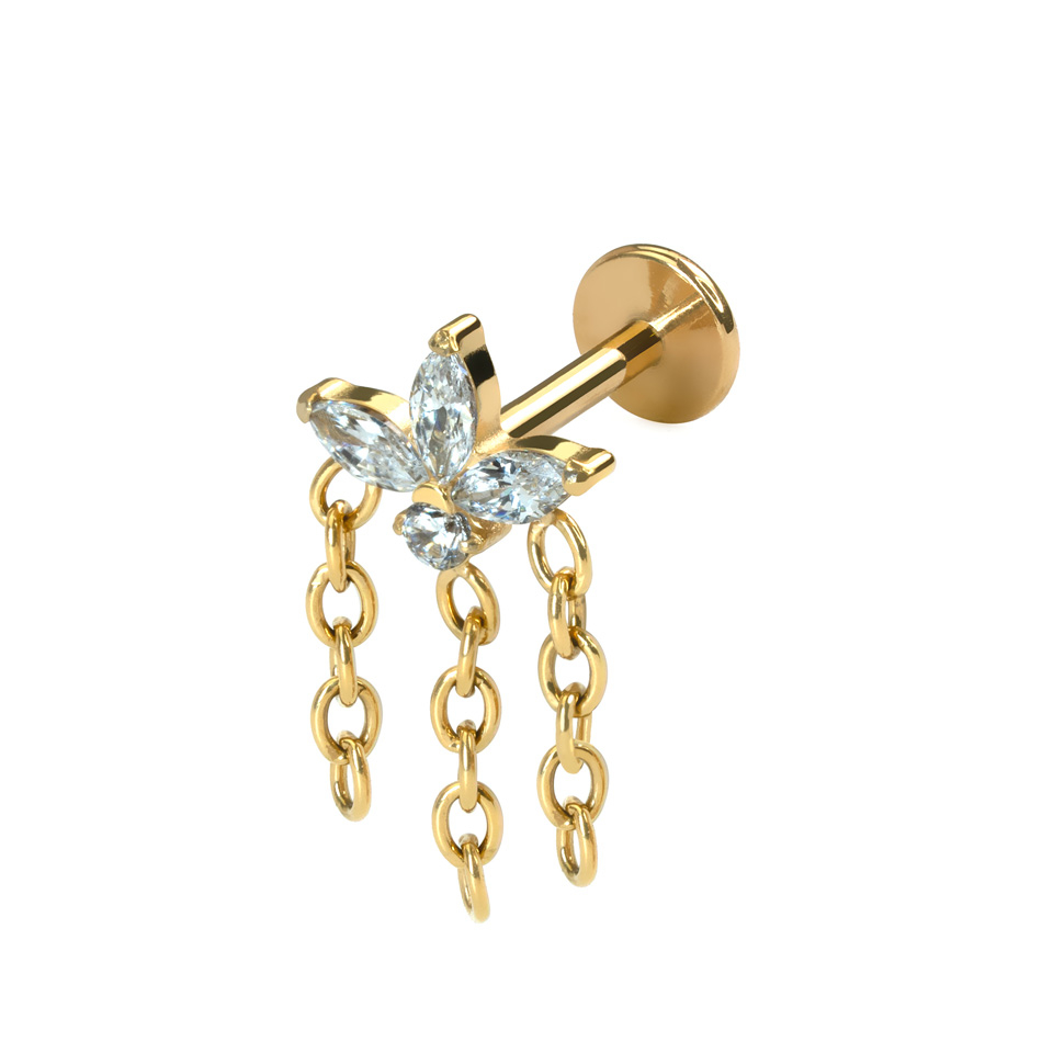 Este original labret luce 4 piedras brillantes circonitas cúbicas, 3 de ellas en corte marquise y dispuestas alrededor de una piedra redonda más pequeña, creando el diseño de una flor. Cada una de las 3 piedras incluye una delicada cadena colgante. La joya tiene un sistema de cierre push-in con el que solo tienes que insertar la barra en tu piercing e introducir el pasador de la parte superior. Su delicado tamaño hace que resulte ideal para varios piercings en la oreja, incluidos el flat, el tragus y las combinaciones de varios piercings en el lóbulo.