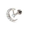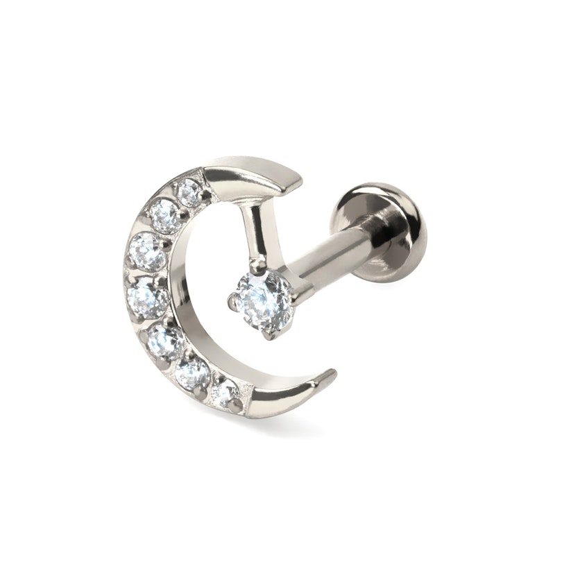 Este precioso labret incluye una luna creciente recubierta de pequeñas circonitas cúbicas y una piedra mayor en el centro que representa una estrella.