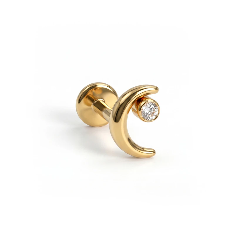 El labret de titanio con luna y estrella une ambas formas en una pieza pequeña y curvada. La luna queda pegada a la piel, con una pequeña piedra incrustada que representa una estrella, creando un detalle compacto. Encaja fácil en diferentes combinaciones y aun así se siente único. Disponible en color dorado y plateado.