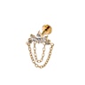 El labret de titanio con pedrería y cadenas no pasa desapercibido. Cinco piedras coronan la parte superior, con tres cortes marquesa que forman una flor y dos piedras redondas que la enmarcan, mientras que dos delicadas cadenas cuelgan por debajo, añadiendo movimiento y actitud de un solo golpe.