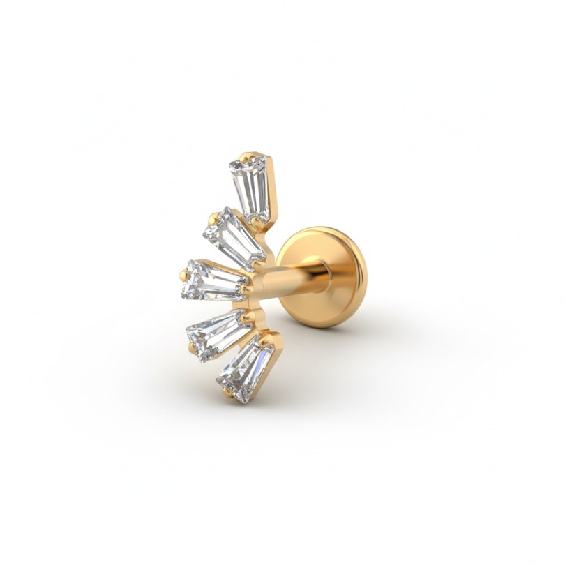 El labret de titanio con piedras de corte baguette está diseñado para momentos que requieren estructura. Las piedras con corte baguette se alinean de forma limpia y definida, adaptándose perfectamente a la oreja para un look que busca el equilibrio.