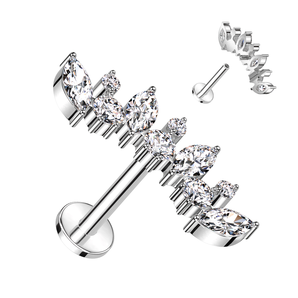 Este precioso labret de titanio alterna piedras brillantes redondas con piedras marquise. La forma curvada del diseño encaja especialmente en piercings en el lóbulo o hélix, siguiendo la forma de la oreja.